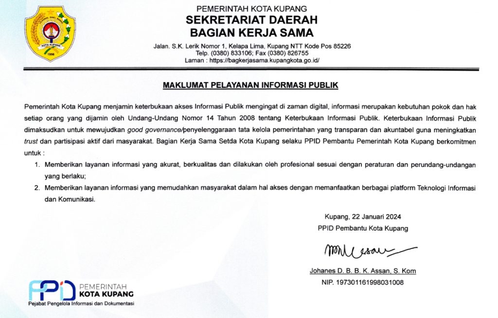 Pemerintah Kota Kupang menjamin keterbukaan akses Informasi Publik mengingat di zaman digital, informasi merupakan kebutuhan pokok dan hak setiap orang yang dijamin oleh Undang-Undang Nomor 14 Tahun 2008 tentang Keterbukaan Informasi Publik. Keterbukaan Informasi Publik dimaksudkan untuk mewujudkan good governance/penyelenggaraan tata kelola pemerintahan yang transparan dan akuntabel guna meningkatkan trust dan partisipasi aktif dari masyarakat. Bagian Kerja Sama Setda Kota Kupang selaku PPID Pembantu Pemerintah Kota Kupang berkomitmen untuk: